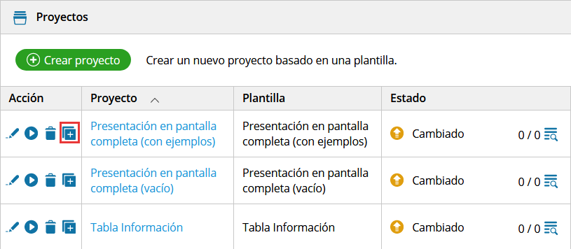 Con la ayuda del botón Copiar en la página Proyectos, puede duplicar un proyecto completo con un solo clic. El proyecto copiado se muestra con el mismo nombre y la nota Copiar en la lista de proyectos.