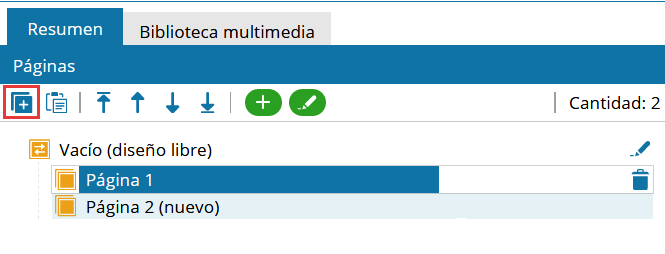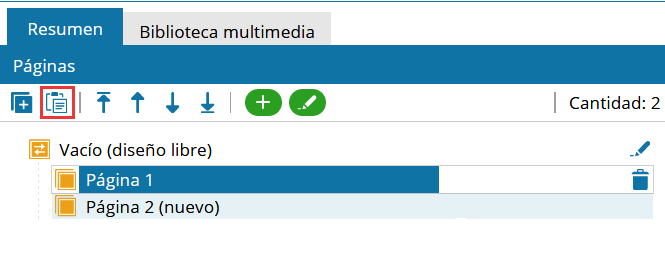 Para copiar una página, seleccione la página correspondiente en la sección Páginas de la Vista previa del Panel de edición (Inspector) y luego presione el botón Copiar en la Barra de herramientas de la página.