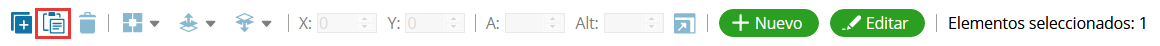 Para copiar un elemento, debe seleccionar el elemento correspondiente (por ejemplo, en la Vista previa) y luego presione el botón Copiar en la Barra de herramientas principal o en la Barra de herramientas del Panel de Edición (Inspector). Luego seleccione el contenedor en el que desea pegar el elemento copiado.