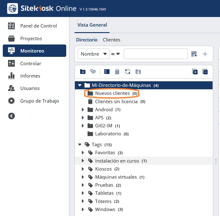 En encontraremos las máquinas recién registradas en una carpeta llamada Nuevas Máquinas, o bien Nuevos Clientes, dentro de nuestro árbol-directorio. Y podremos crear una estructura de carpetas y subcarpetas para organizar las máquinas según nuestro criterio de preferencia. Además podremos incluirlas en distintas Etiquetas, como criterio de clasificación múltiple (cada máquina puede estar incluida en más de una etiqueta).