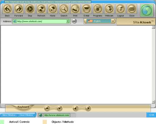 El siguiente gráfico le muestra el diseño de navegador por defecto de SiteKiosk. Haga clic en un objeto para más información.