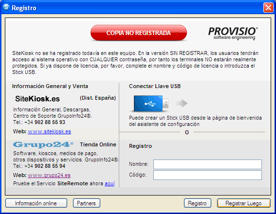 Pulsando el botón registrar luego, SiteKiosk arrancará normalmente, con las únicas restricciones