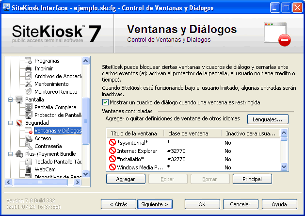 SiteKiosk chequea constantemente todas las nuevas ventanas y cuadros de diálogo abiertos y los compara con las