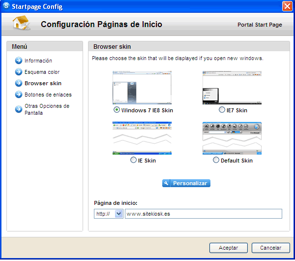 - Elegir una Plantilla de navegador simple (Default, IE, IE7, Touch Me Skin, IE8 Windows 7, Full Screen, GSS Skin, Desktop Start Page, etc.), y establecer su Página de Inicio propia