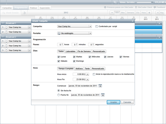 Mediante la programación purede especificar cuándo quiere exactamente que sus campañas se inicien y se terminen. Puede reproducir los contenidos en ciertas horas, días de semana y días del calendario.