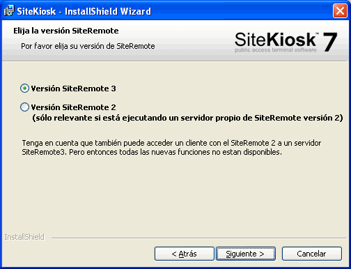 En la siguiente pantalla, elija la versión SiteRemote 3 salvo que disponga de una servidor propio con la versi&oaucte;n 2.
