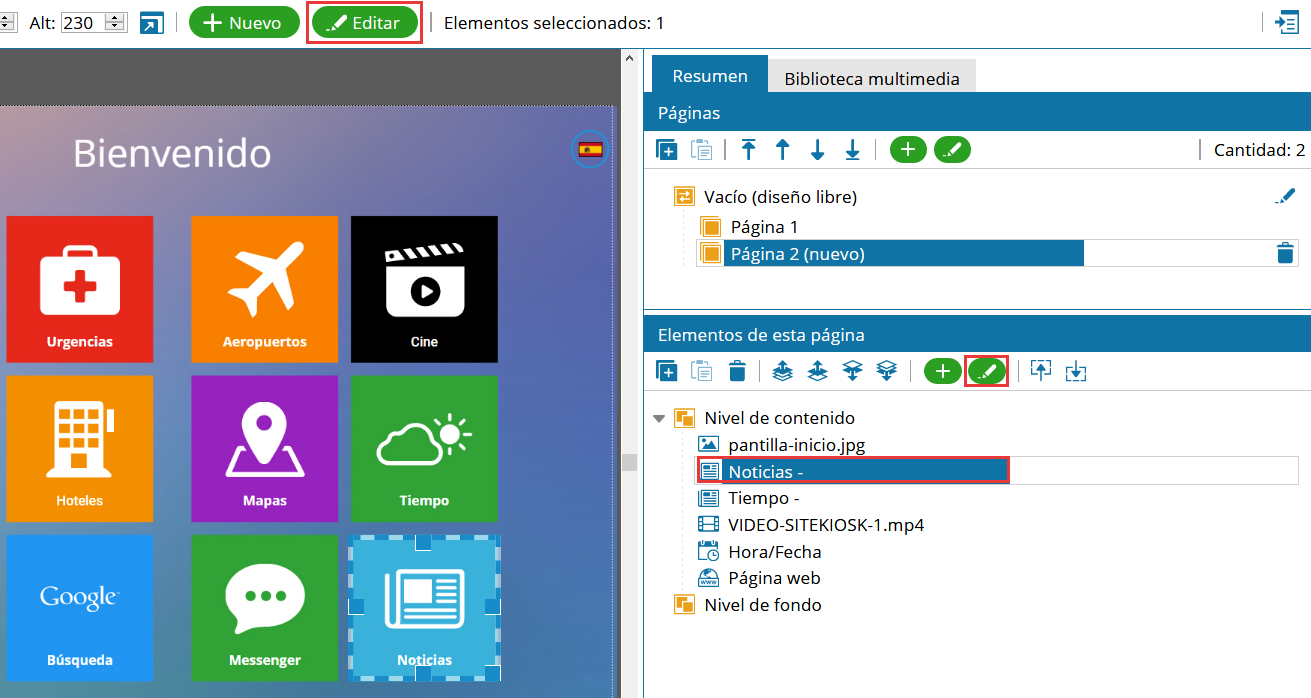 Puede seleccionar elementos para editar con un simple clic del ratón o arrastrando un marco de selección dentro de un contenedor en la