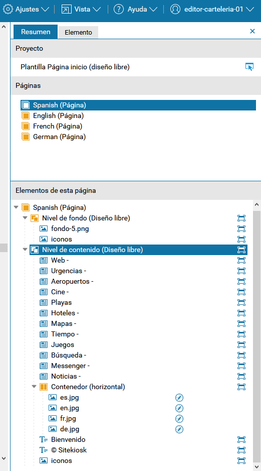 La pestaña Vista general en el Panel de Edición le ofrece una descripción general de las páginas y elementos contenidos en este proyecto. Dentro de la vista general, puede seleccionar elementos con el ratón y luego editar, copiar, mover o insertar nuevos elementos en el proyecto. Además, los íconos en la Vista general muestran si se han establecido pop-ups, condiciones de visualización o enlaces de navegación en los elementos respectivos.