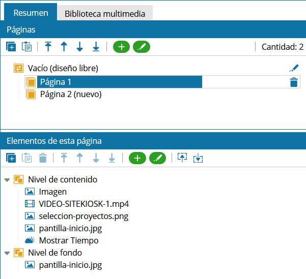 De esta manera, puede crear un proyecto con varias páginas, que se pueden programar, por ejemplo, para que se muestren en períodos de tiempo específicos, controlados por eventos en la interacción del usuario o mostrados según la asignación de pantalla (Monitor 1 y Monitor 2).