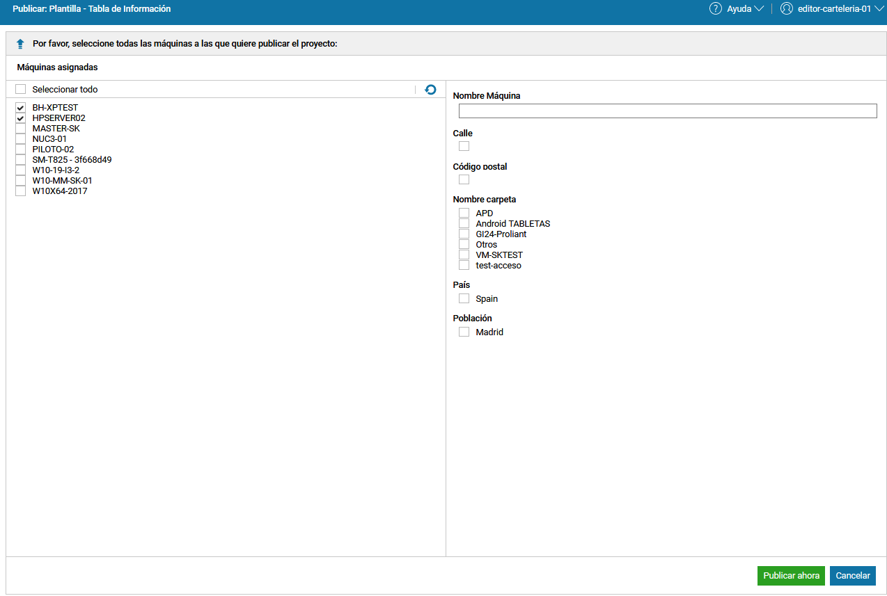 Publicar desde la que puede seleccionar las máquinas clientes en las que publicar su proyecto.