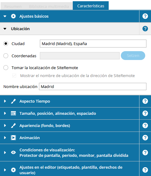- Utilizar ubicación desde SiteRemote: al utilizar esta opción, la visualización del Tiempo utiliza la ubicación de la máquina que se ha establecido en SiteRemote. La visualización del clima solicita la información de ubicación de forma dinámica, por lo que los cambios que realice en la información de ubicación en SiteRemote se reflejan rápidamente en SiteCaster.