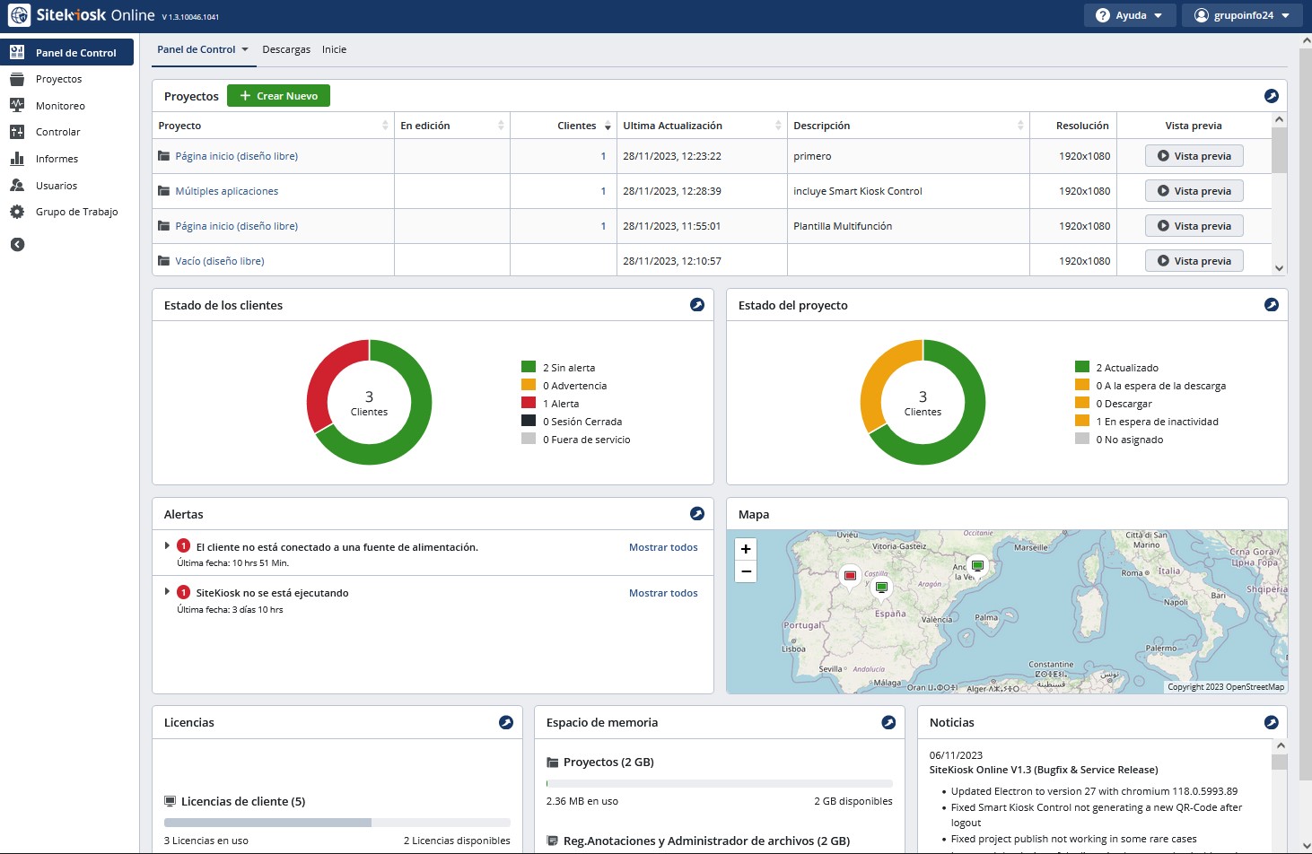 - Actualizado. Significa que el proyecto está publicado y funcionando correctamente en la/s máquinas a las que se ha asignado. Y también que está actualizado con la última versión de SiteKiosk Online servidor.