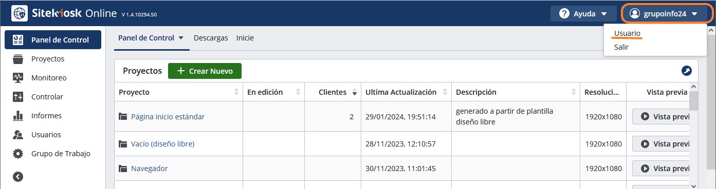 - Usuario: le llevará para acceder al menú de Usuarios desde donde puede:
