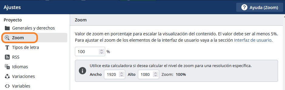 Si el proyecto debe a estar disponible para una resolución específica, use la calculadora ubicada debajo de la configuración.