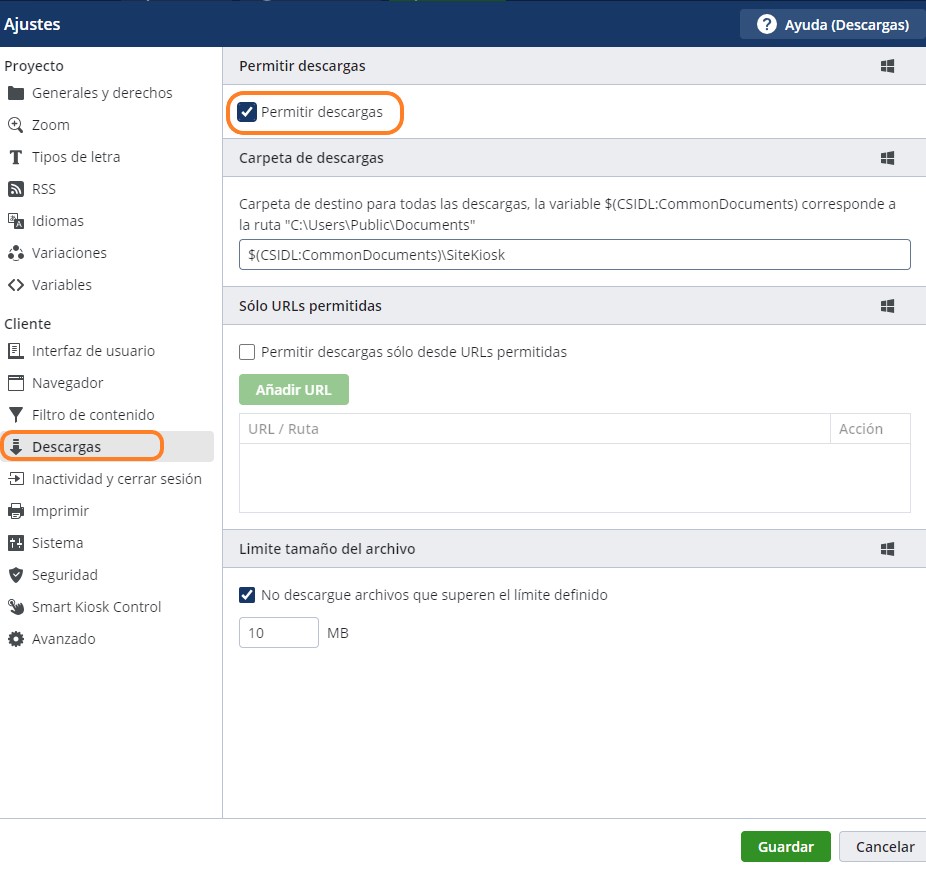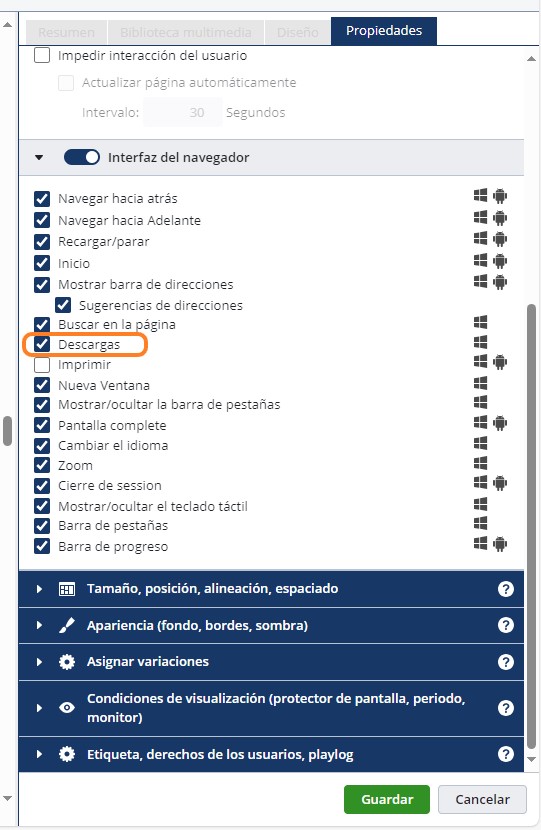 En los ajustes del elemento Web, desde Interfaz de Usuario (Browser UI), seleccionamos la opción Descargas y salvamos el ajuste.