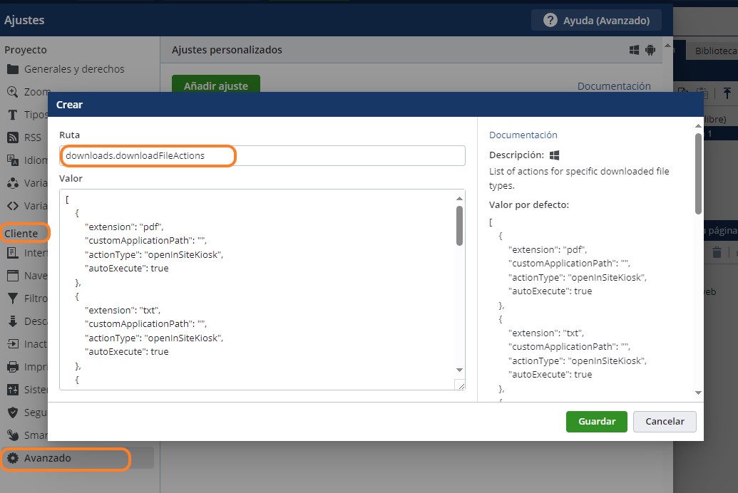 Ingrese la ruta downloads.downloadFileActions que le ofrece el siguiente valor predeterminado: