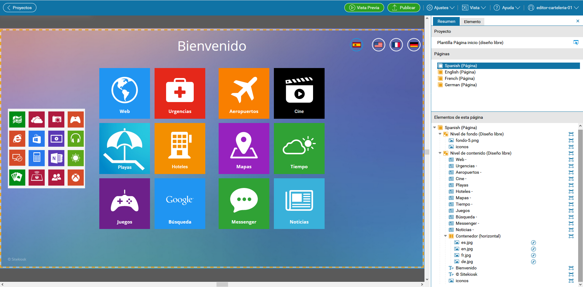 La pestaña Vista general en el Panel de Edición le ofrece una descripción general de las páginas y elementos contenidos en este proyecto. Dentro de la vista general, puede seleccionar elementos con el ratón y luego editar, copiar, mover o insertar nuevos elementos en el proyecto. Además, los íconos en la Vista general muestran si se han establecido pop-ups, condiciones de visualización o enlaces de navegación en los elementos respectivos.