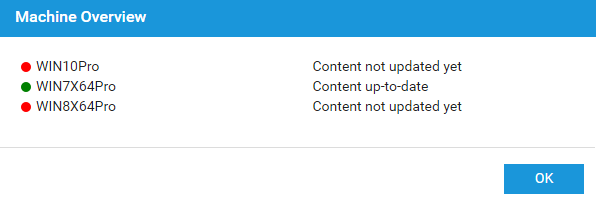 Puede suceder que el mensaje "Contenido no actualizado todavía" se muestre durante mucho tiempo aunque la máquina esté en línea. Esto puede tener diferentes razones: por ejemplo, una mala conexión a Internet puede provocar una descarga lenta o el proyecto contiene muchos datos que provocarán una descarga prolongada. Además, una actualización de la aplicación para el cliente respectivo puede provocar una visualización retrasada del proyecto, porque el contenido no se descarga hasta que la aplicación esté actualizada.
