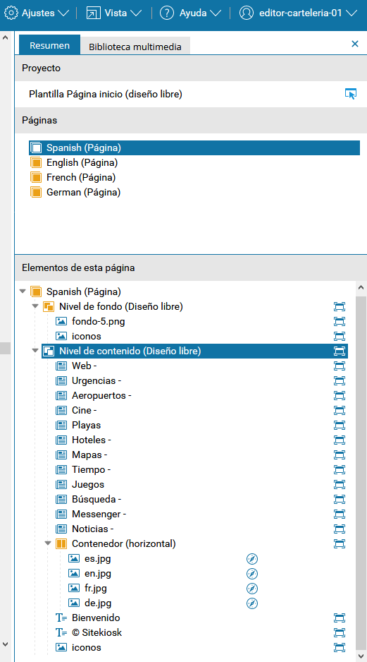 Editar en la barra de herramientas de la página. Después de seleccionar una página, todos los elementos de esta página se enumeran en la sección