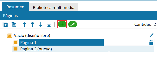 Las plantillas de página se pueden insertar mediante el botón + más en Barra de herramientas de la página junto a las páginas existentes. Al insertar plantillas de página en un elemento contenedor, se crea un Contenedor de página (titulado "Nueva página"), que contiene una capa de contenido y una capa de fondo.