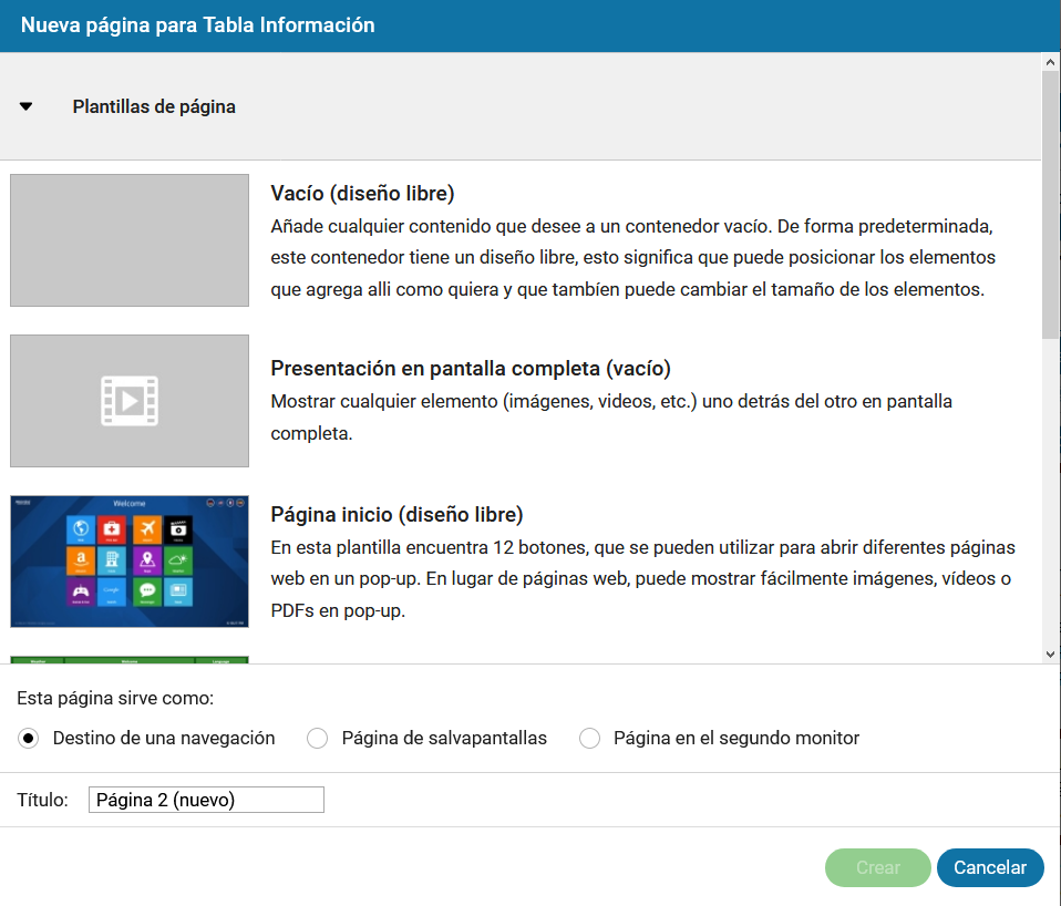 Con la creación de una nueva página, puede definir el título de la nueva página y su función (Destino de una página de navegación, Protector de pantalla o Página en la segunda pantalla).
