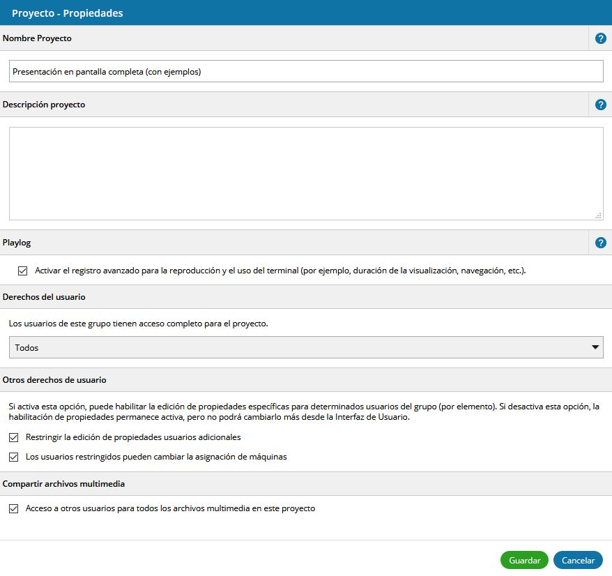 Mediante los Ajustes de Proyecto puede editar el nombre de su proyecto, introducir un texto de descripción, permitir a los usuarios restringidos acceder al proyecto, u otorgar acceso completo a otro grupo de usuarios.