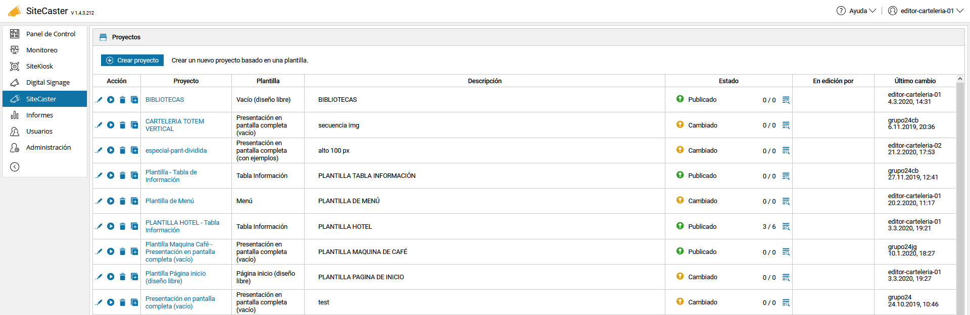 Si un proyecto está siendo editado actualmente por un usuario (y por tanto bloqueado), el nombre de usuario se mostrará en la columna: En edición por. En Última modificación se indica la fecha y hora en el que proyecto se ha guardado por última vez, y el nombre de usuario que lo salvó.