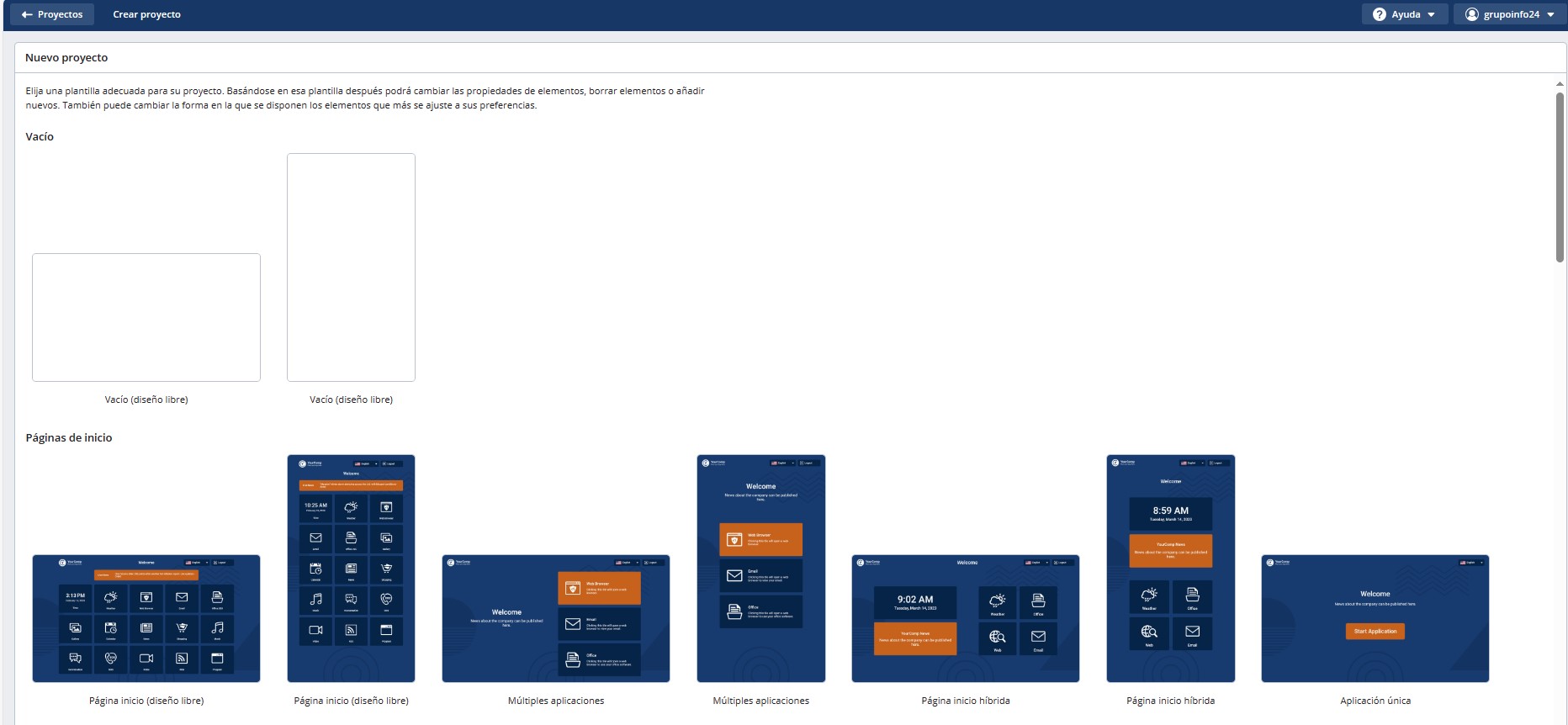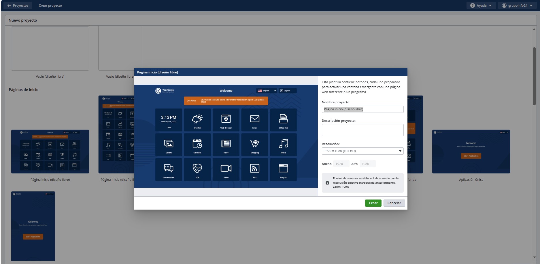 El botón Crear abre el editor de proyectos con la plantilla seleccionada.