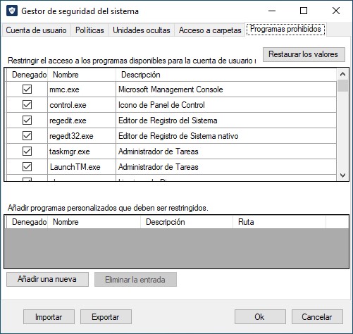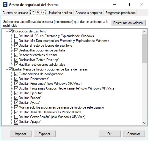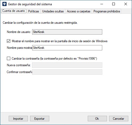 Las políticas del Gestor de Seguridad controlan importantes ajustes de seguridad sobre funciones no permitidas por defecto en SiteKiosk.
