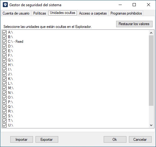 SiteKiosk protege por defecto el acceso a las unidades de disco o almacenamiento distintas a la unidad C: principal. Si necesita conceder acceso a otras unidades puede hacerlo desde este apartado. Observe que por defecto todas las unidades están protegidas (no se permite el acceso), pero puede desmarcar las unidades que necesite: