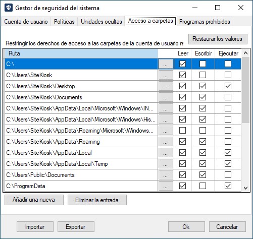 SiteKiosk protege por defecto el acceso a las carpetas que no son necesarias para el funcionamiento de SiteKiosk o de programas de terceros. Además estable los permisos por defecto necesarios de ejecución, lectura, escritura, etc. Si necesita añadir alguna ruta adicional o cambiar los permisos, puede hacerlo a través de este apartado.