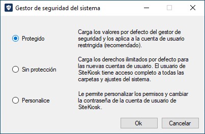 Sin Protección, es el que permite conceder todos los permisos al usuario restringido (por defecto Sitekiosk), que es la cuenta del usuario limitado de Windows con la que arranca SiteKiosk en el modo Auto-Inicio.