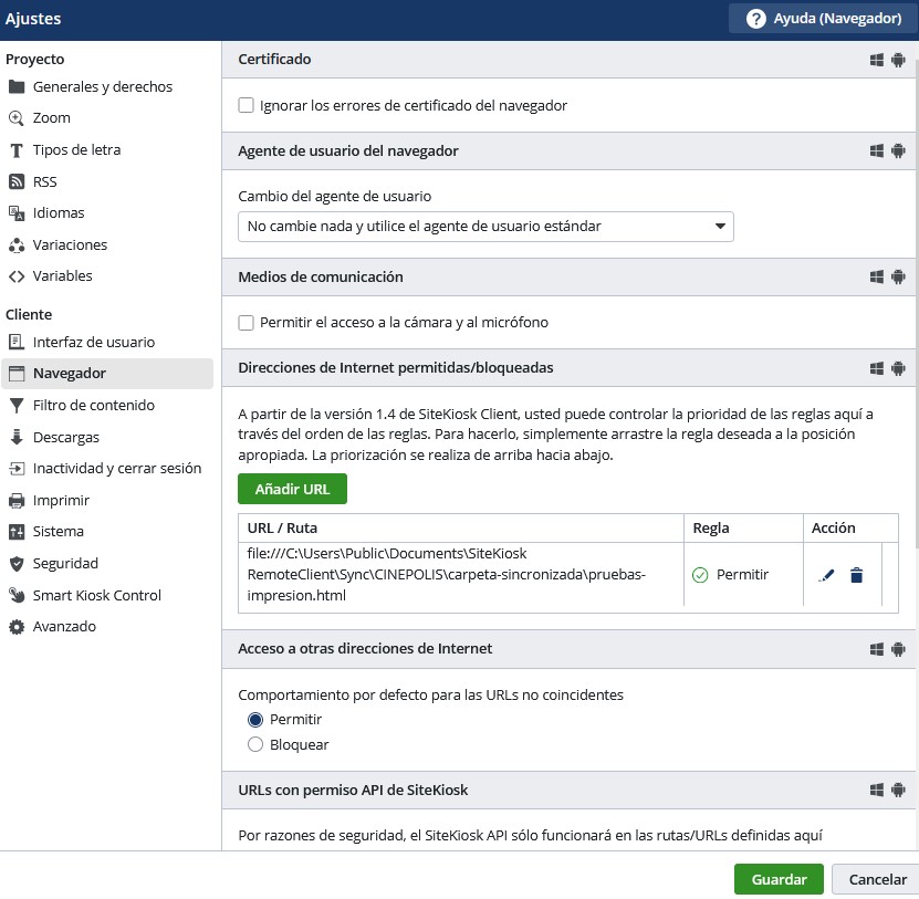 La configuración del navegador determina el comportamiento del navegador interno iniciado desde SiteKiosk y qué opciones están disponibles en las páginas de Internet que se muestran en él.