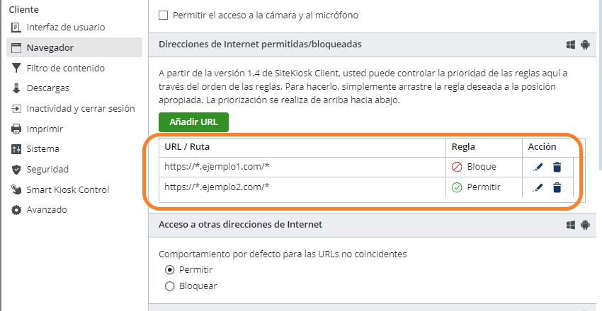 A partir de la versión 1.4 de SiteKiosk Client, estos filtros se pueden priorizar según su orden en la lista. Cuanto más arriba esté la URL en la lista, más importancia tiene.