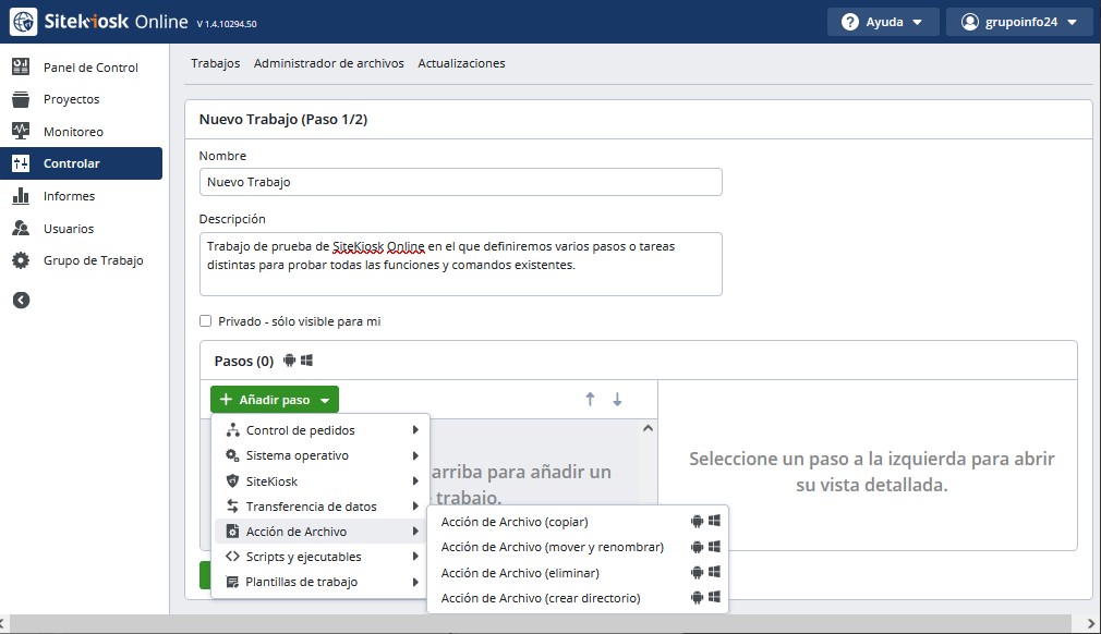 Un Trabajo en SiteKiosk Online es una tarea o conjunto de tareas (o pasos) que podemos asignar a las máquinas cliente para que se ejecuten paso a paso con todos los comandos o incluidos en el trabajo.