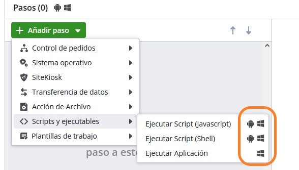 Los tipos de comando o tarea para incluir en cada paso, pueden ser de distinto tipo según la naturaleza del trabajo y quién debe ejecutarlo (ej. el sistema operativo, SiteKiosk, una aplicación externa, un sitio web, etc.), y los comandos concretos son los disponibles según cada tipo. Una lista completa de tipos y comandos disponibles es la siguiente: