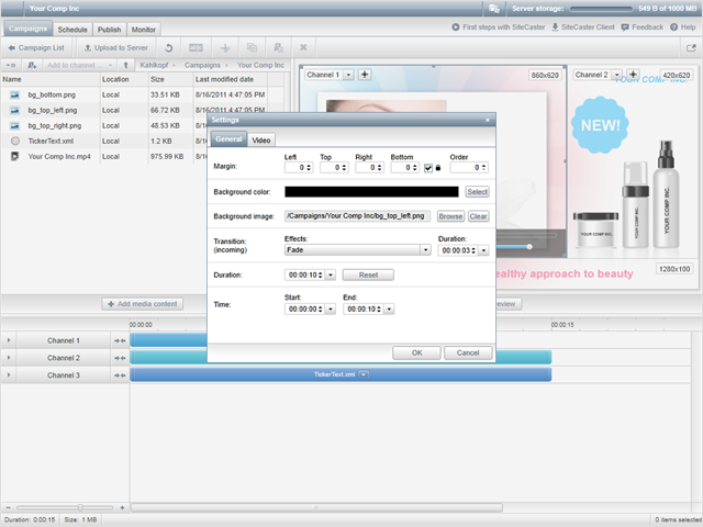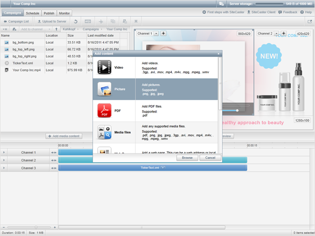 Organice sus archivos multimedia arrastrando y soltando los contenidos en una línea de tiempo para crear sus campañas. Puede utilizar el Administrador de Archivos para organizar sus contenidos e incorporarlos las campañas que necesite.
