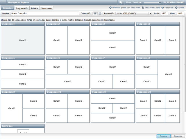 Para la colocación de los medios de comunicación, puede elegir entre una variedad de tipos de diseños predefinidos. Las proporciones de los canales se pueden ajustar libremente. Además, puede utilizar cualquier resolución para la campaña, por ejemplo Full HD (1920x1080) o superior.