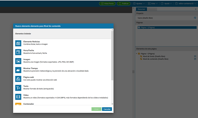 El editor SiteCaster CMS le permite añadir cualquier elemento de contenido en cualquier posición. Al elegir el tipo de elemento el editor le permitirá aplicar las propiedades asociadas: Elemento Noticias (título y texto), Hora/Fecha, Imagen, Página Web, Texto, Video, etc.,; y objetos de grupos de elementos, como: contenedores fijos o flotantes, secuencias.etc-