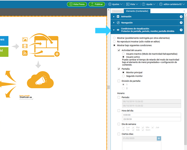 SiteKiosk Online permite establecer para cada elemento, o conjunto de elementos (capa o nivel), las condiciones de visualización. Por ejemplo: mostrar sólo en el editor, mostrar en salvapantallas (usuario inactivo), en pantalla principal, secundaria, en todas o algunas las anteriores, etc., y especificar cuándo quiere exactamente mostrarlos: intervalo de fechas, ciertos días, etc.