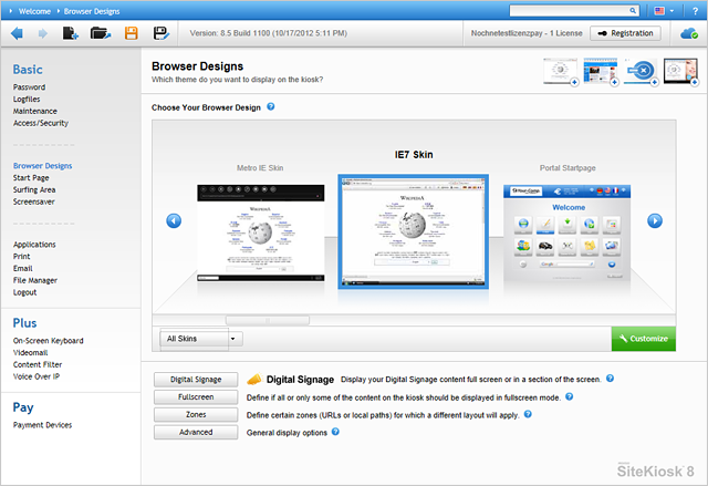 La versión de SiteKiosk Pay, soporta el uso de distintos dispositivos de pago: monedero, lectores de billetes, SmartCards, tarjetas de crédito, etc, y es tambíen la forma ideal para utilizar máquinas de quiosco sin riesgo de robo en locales menos vigilados.