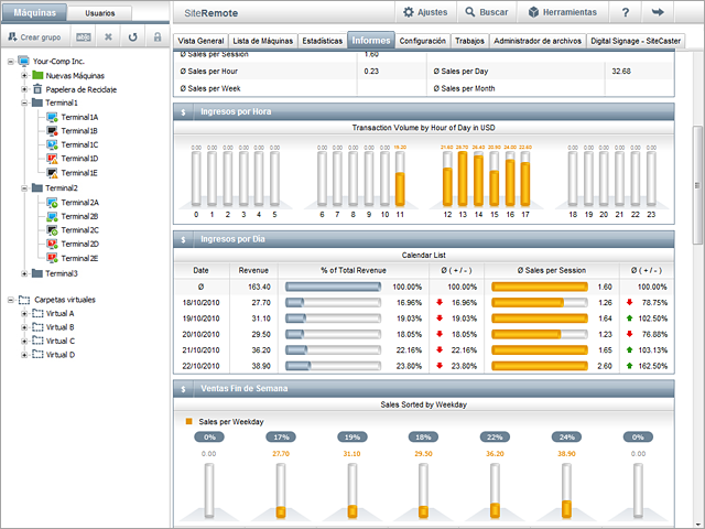 Si utiliza la versión SiteKiosk Pay, recibirá información adicional sobre las ventas totales, sobre la recaudación de las máuinas, volumen de ventas en efectivo. Los informes pre-definidos proporcionan información sobre los días y máquinas de mayor venta, y otras de utilidad para los administradores al cargo del parque de máquinas en régimen de servicio de pago.